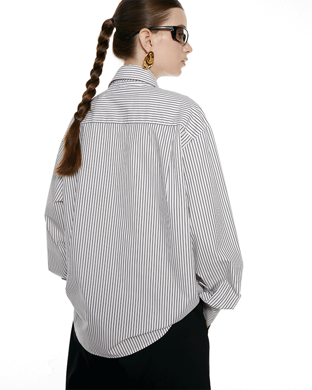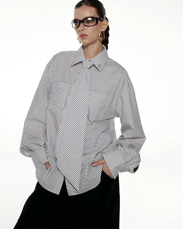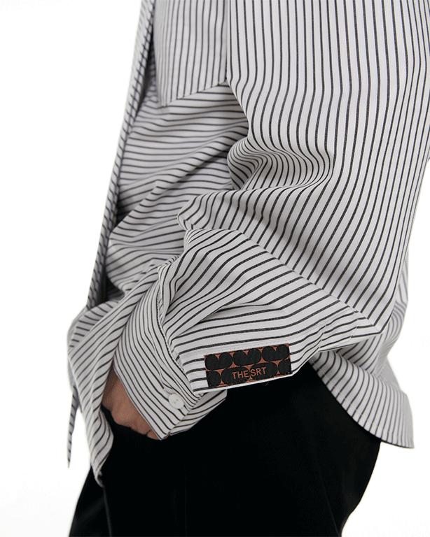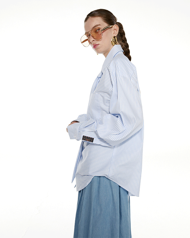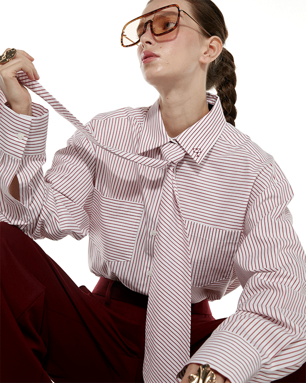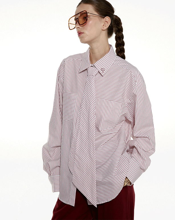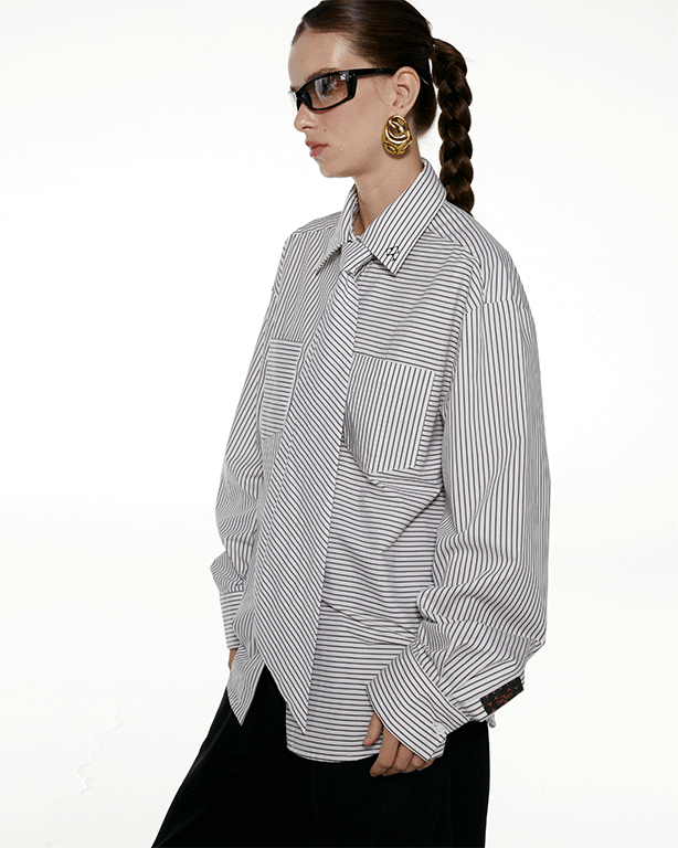 เสื้อเชิ้ตลายทางทรงโอเวอร์ไซส์ มีกระเป๋าหน้าอกทั้งสองฝั่ง ดีเทลลายผ้าสลับด้านระหว่างตัวเสื้อและกระเป๋า มาพร้อมผ้าผูกเนกไทในเซ็ต เพิ่มลูกเล่นให้ลุคได้หลากหลาย