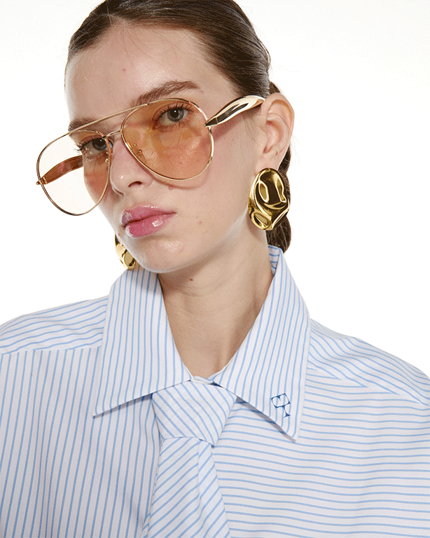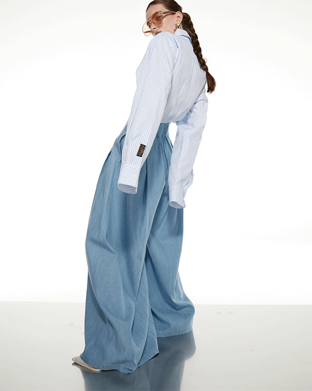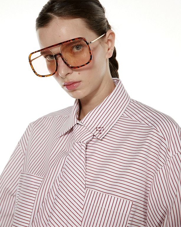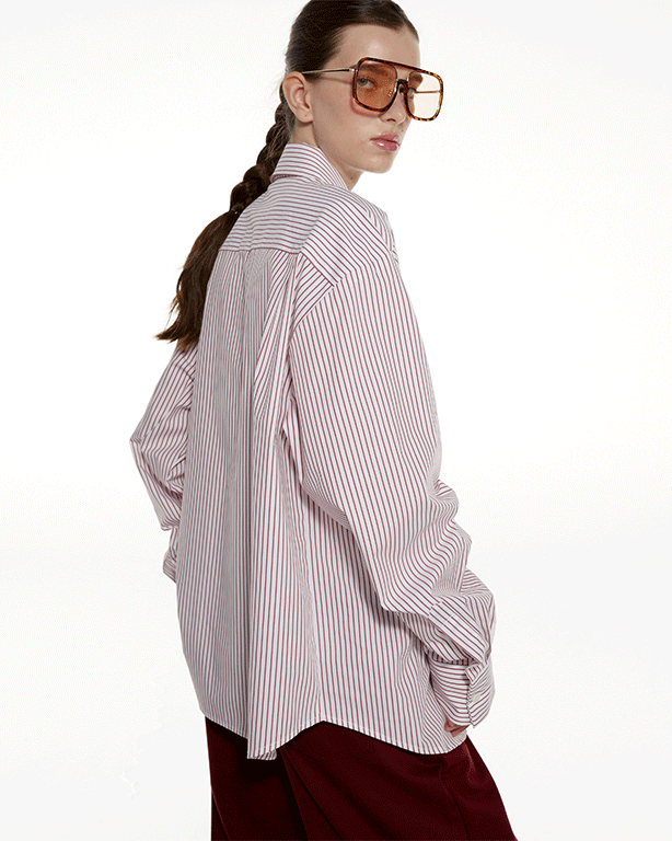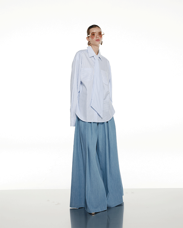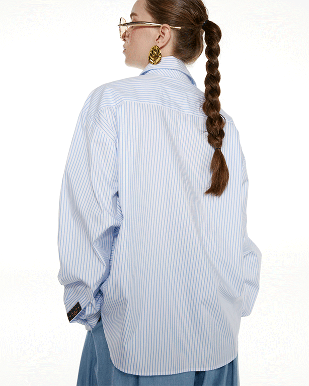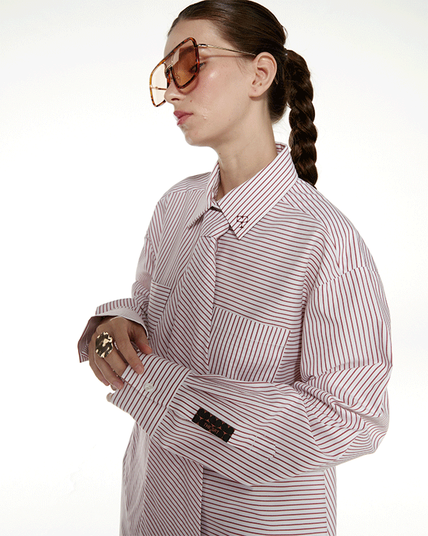 เสื้อเชิ้ตลายทางทรงโอเวอร์ไซส์ มีกระเป๋าหน้าอกทั้งสองฝั่ง ดีเทลลายผ้าสลับด้านระหว่างตัวเสื้อและกระเป๋า มาพร้อมผ้าผูกเนกไทในเซ็ต เพิ่มลูกเล่นให้ลุคได้หลากหลาย