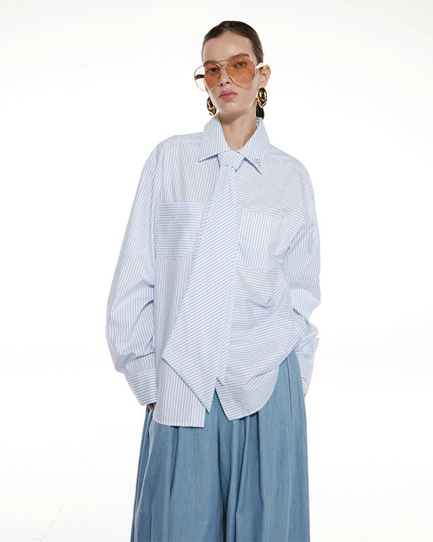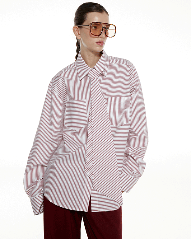 Oversized striped shirt featuring dual chest pockets and contrasting stripe placements on each side and pocket for a unique twist. Comes with a matching fabric tie for added styling versatility.