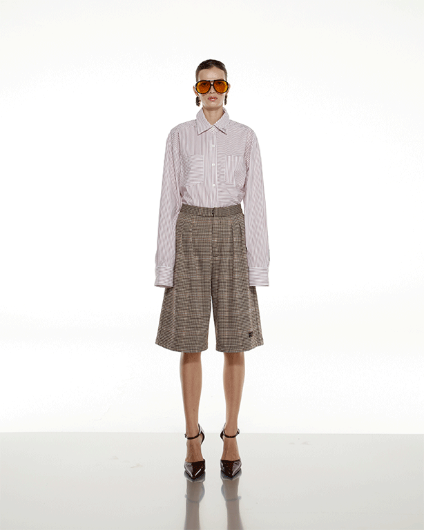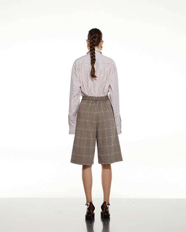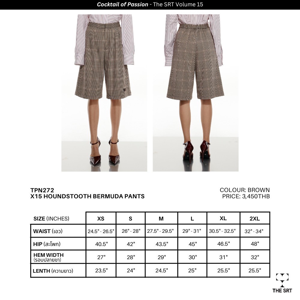 กางเกงขาสั้นทรงเบอร์มิวดา ลาย Houndstooth สีน้ำตาล ดีไซน์ซิปหน้า มีกระเป๋าข้างทั้งสองฝั่ง ลุคเรียบหรู คลาสสิกแต่ทันสมัย