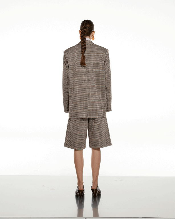 Brown houndstooth Bermuda shorts with a front zip closure and dual side pockets. A tailored yet relaxed piece that brings a touch of vintage charm to your modern wardrobe.