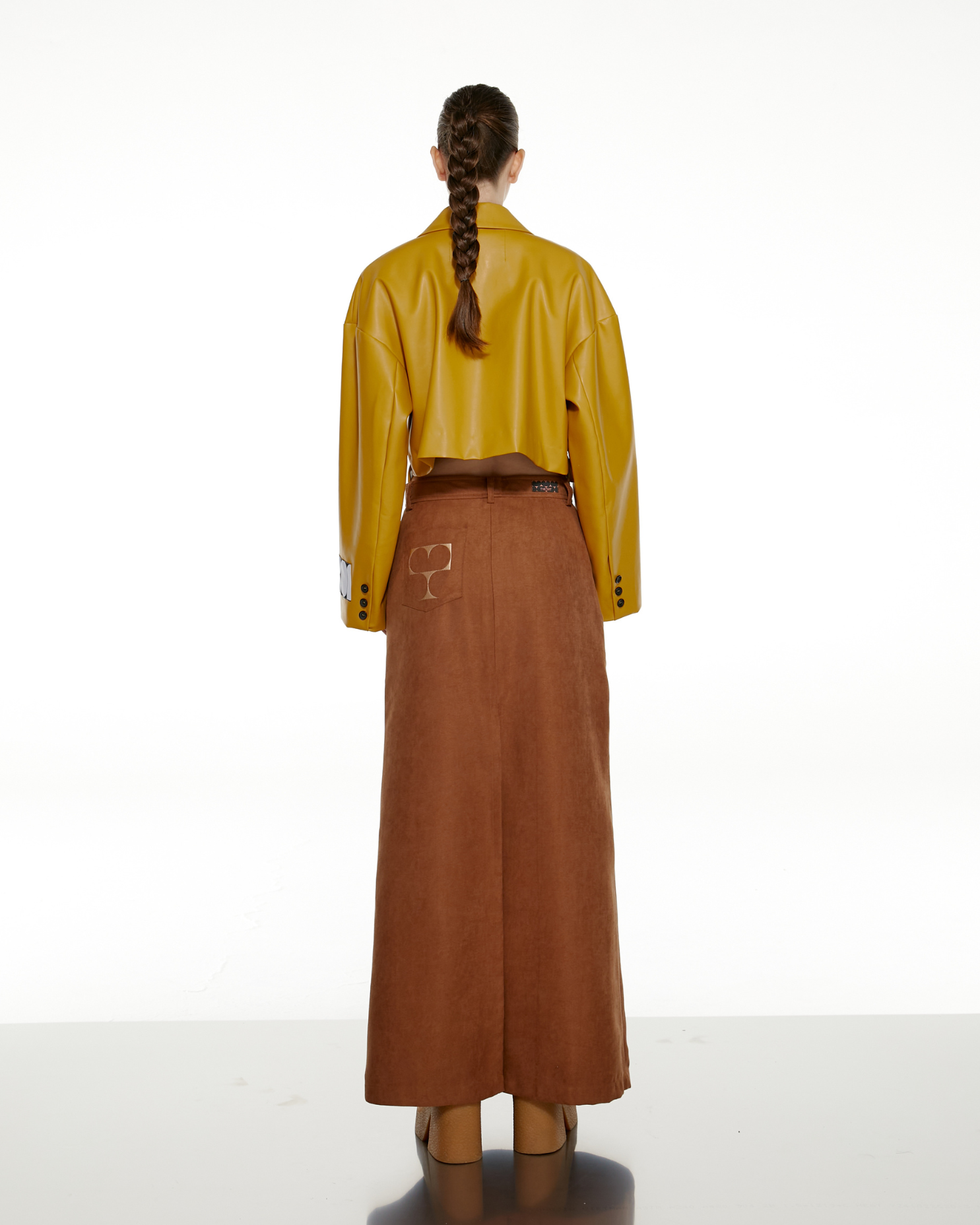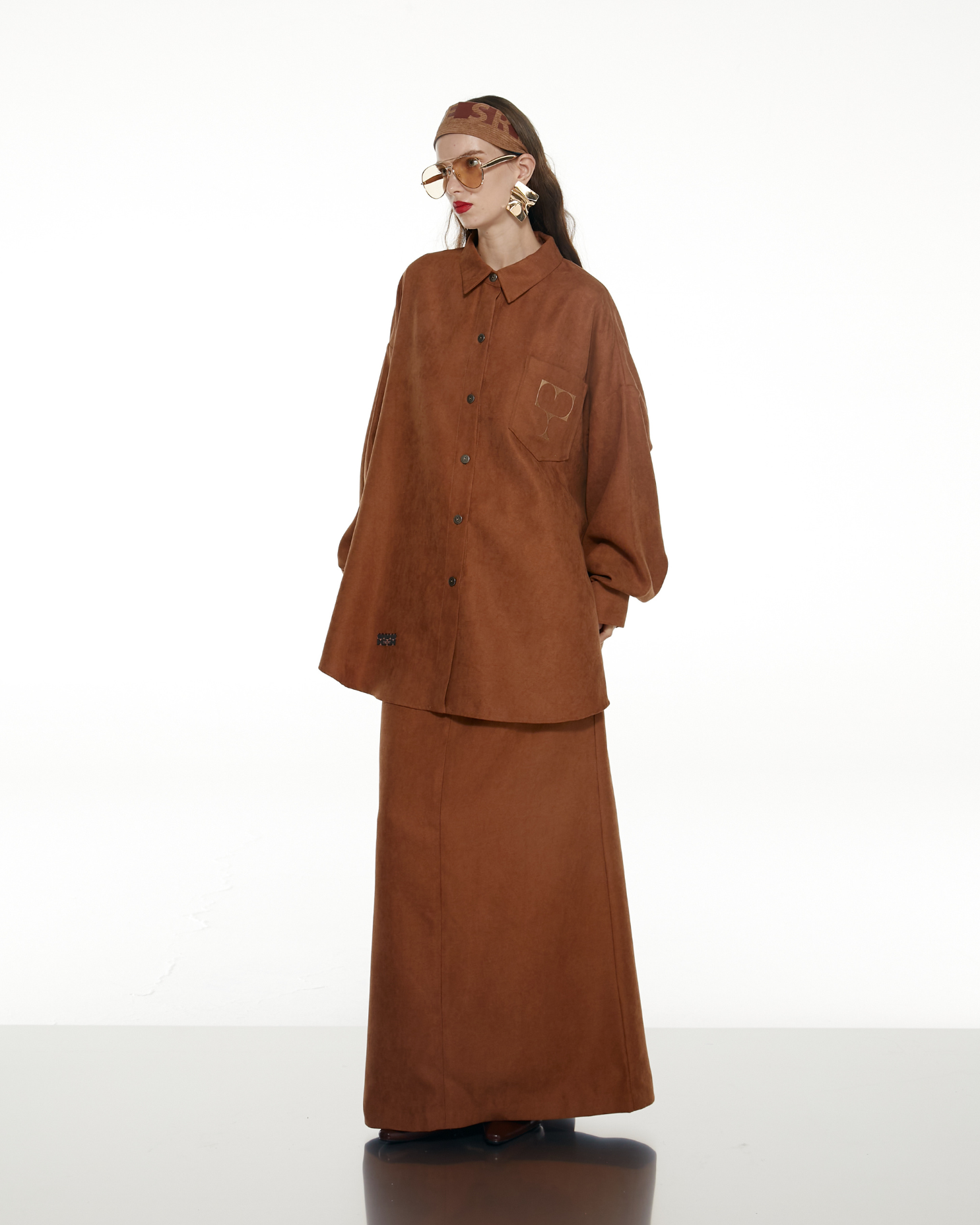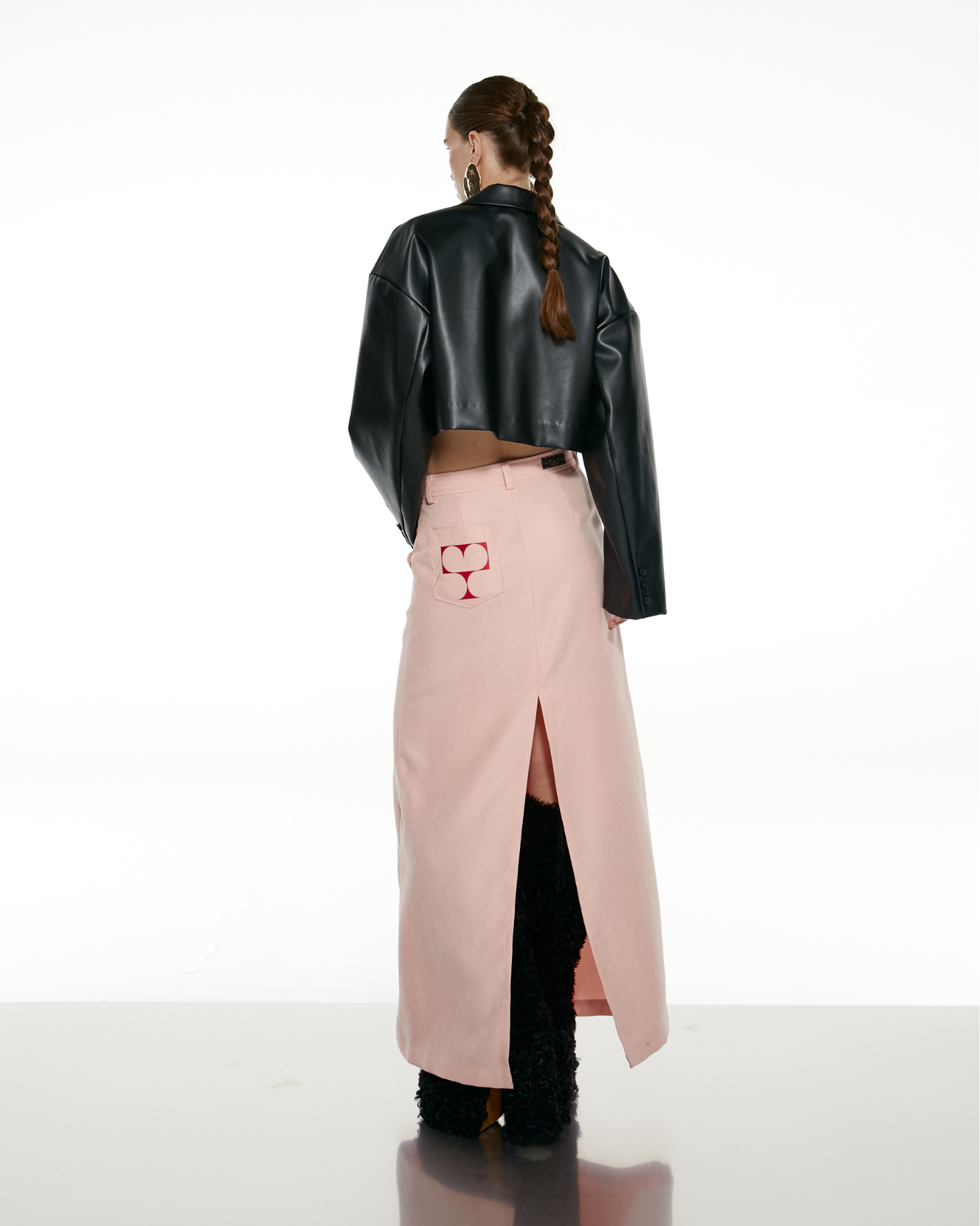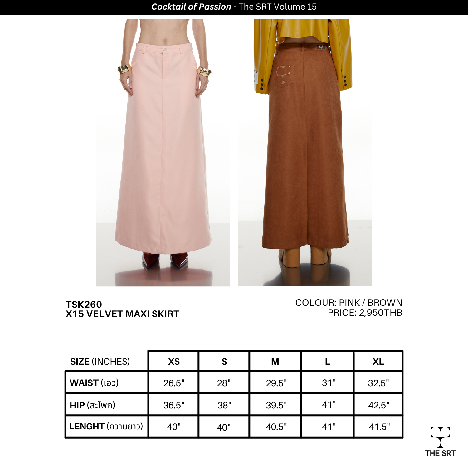 กระโปรงยาวทรงเอผ้ากำมะหยี่ มาพร้อมซิปหน้าสวมง่าย มีกระเป๋าข้างทั้ง 2 ข้าง และกระเป๋าหลังปักโลโก้ ‘The SRT’ ดีไซน์ใหม่ — หัวใจผสมแก้วไวน์ ที่สะท้อนแพสชันและบาลานซ์ในชีวิต ผ่าหลังเล็กน้อยเพื่อความคล่องตัว