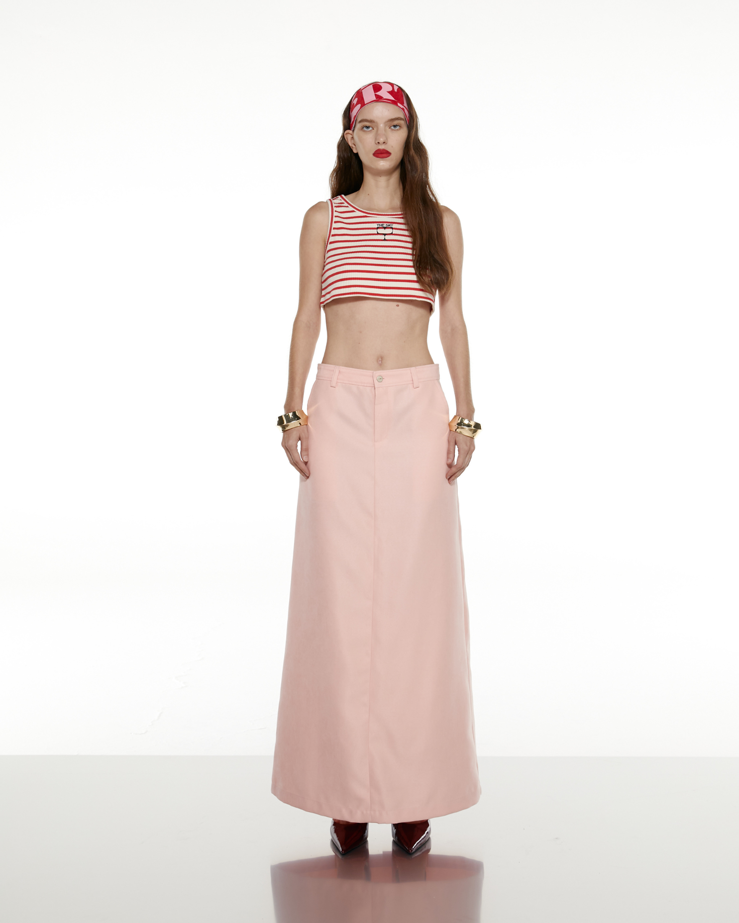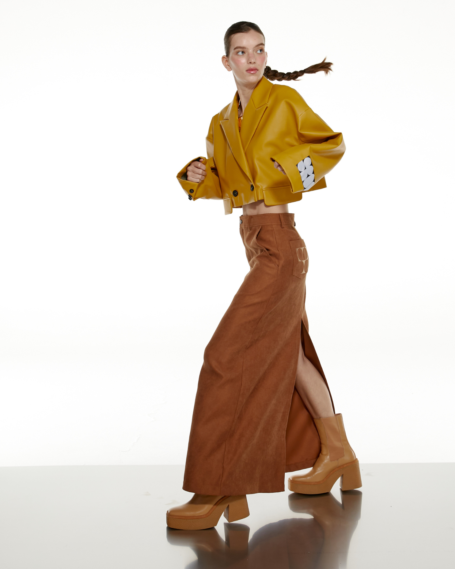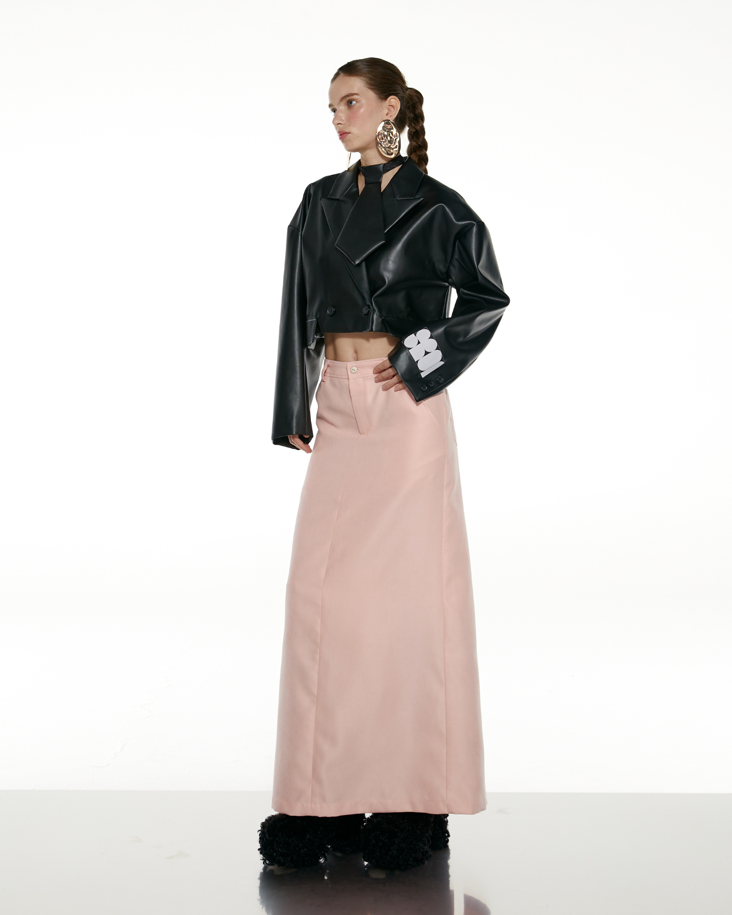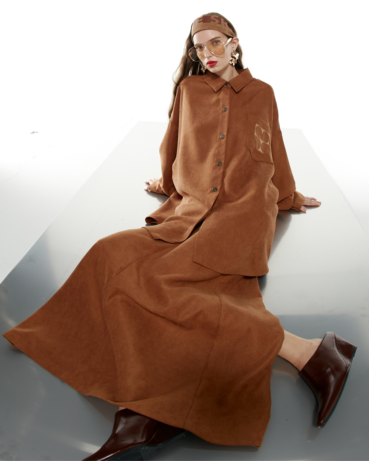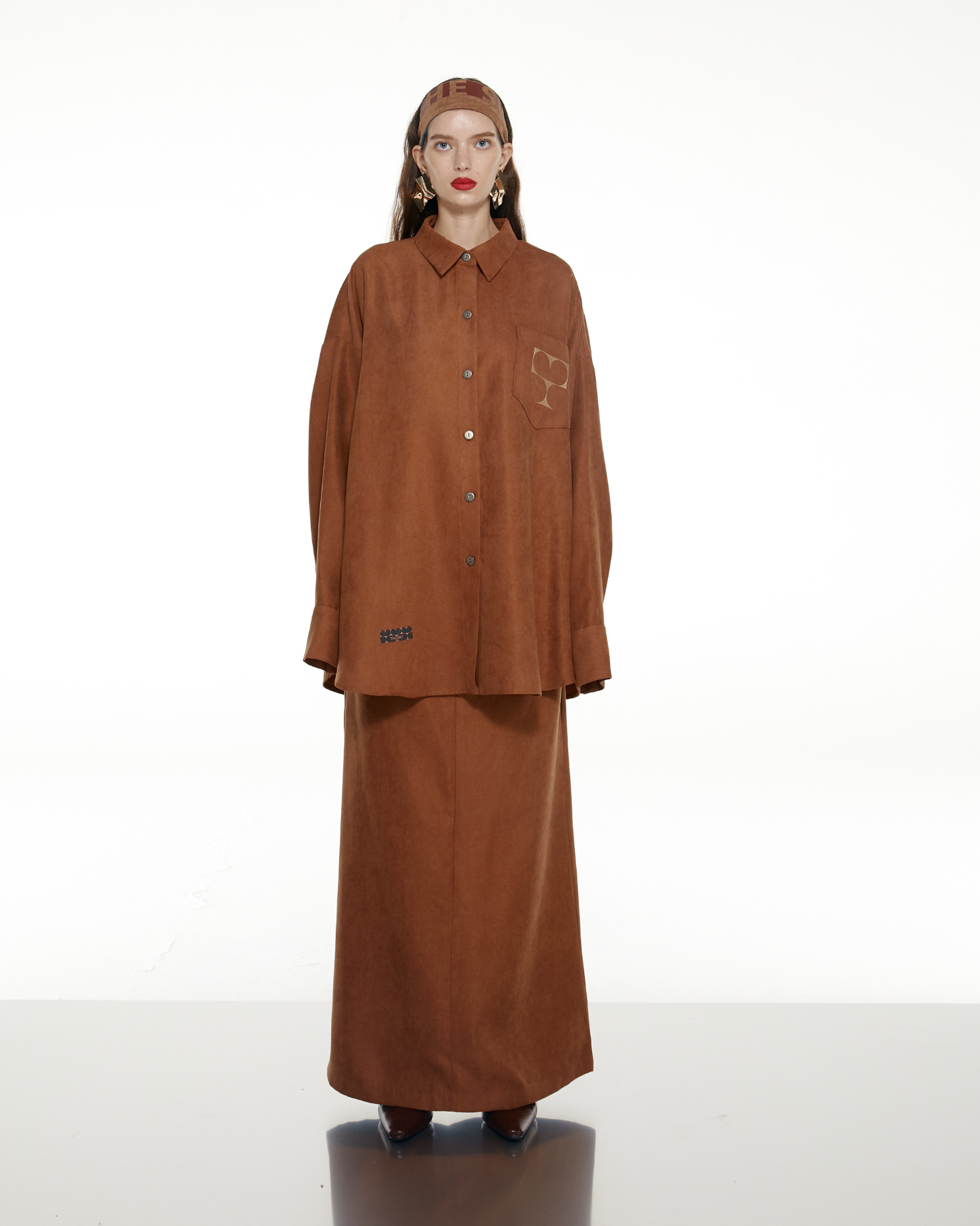 กระโปรงยาวทรงเอผ้ากำมะหยี่ มาพร้อมซิปหน้าสวมง่าย มีกระเป๋าข้างทั้ง 2 ข้าง และกระเป๋าหลังปักโลโก้ ‘The SRT’ ดีไซน์ใหม่ — หัวใจผสมแก้วไวน์ ที่สะท้อนแพสชันและบาลานซ์ในชีวิต ผ่าหลังเล็กน้อยเพื่อความคล่องตัว