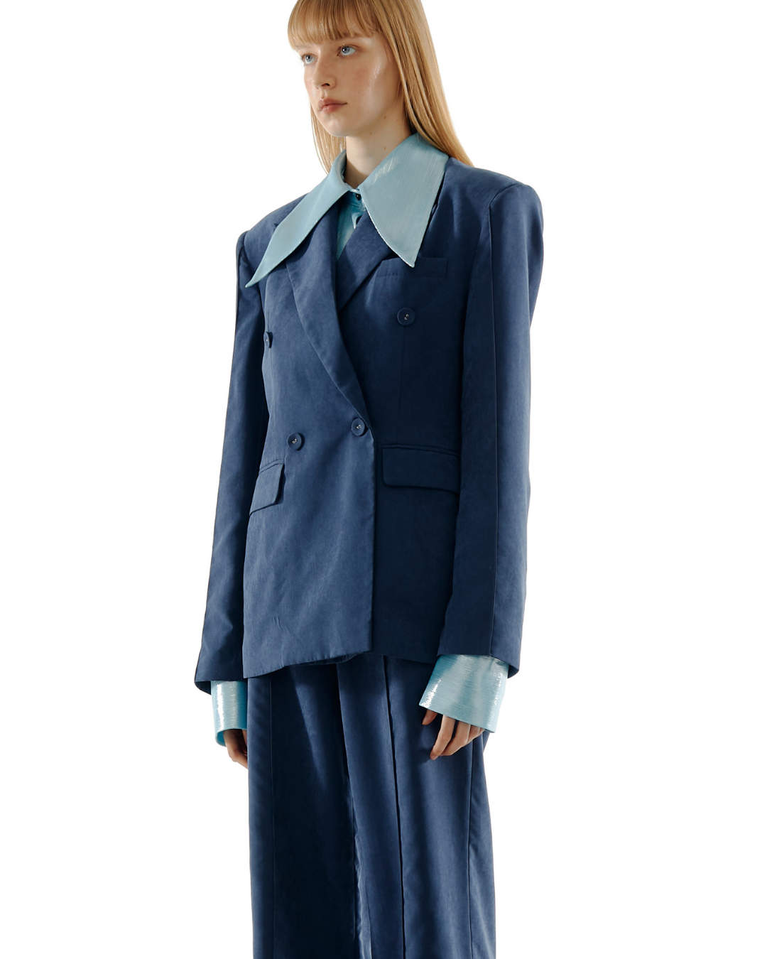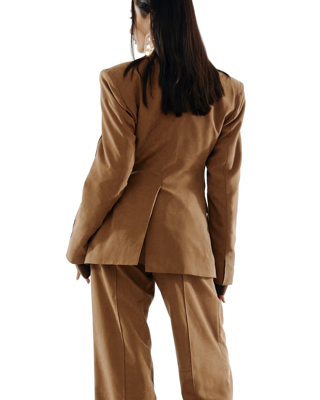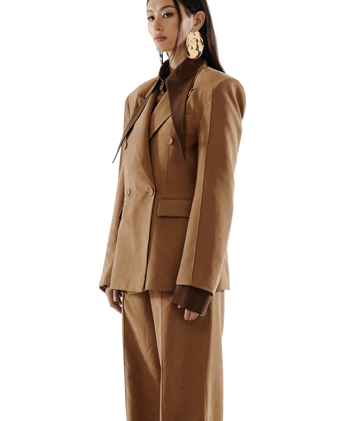 เสื้อเบลเซอร์ผ้าหนังกลับ แขนยาวที่ปลายแขนมีผ่าพร้อมกระดุม มีกระเป๋าด้านหน้าและกระเป๋าที่หน้าอก ชายเสื้อตรง ติดกระดุมด้านหน้า และผ่าด้านหลัง