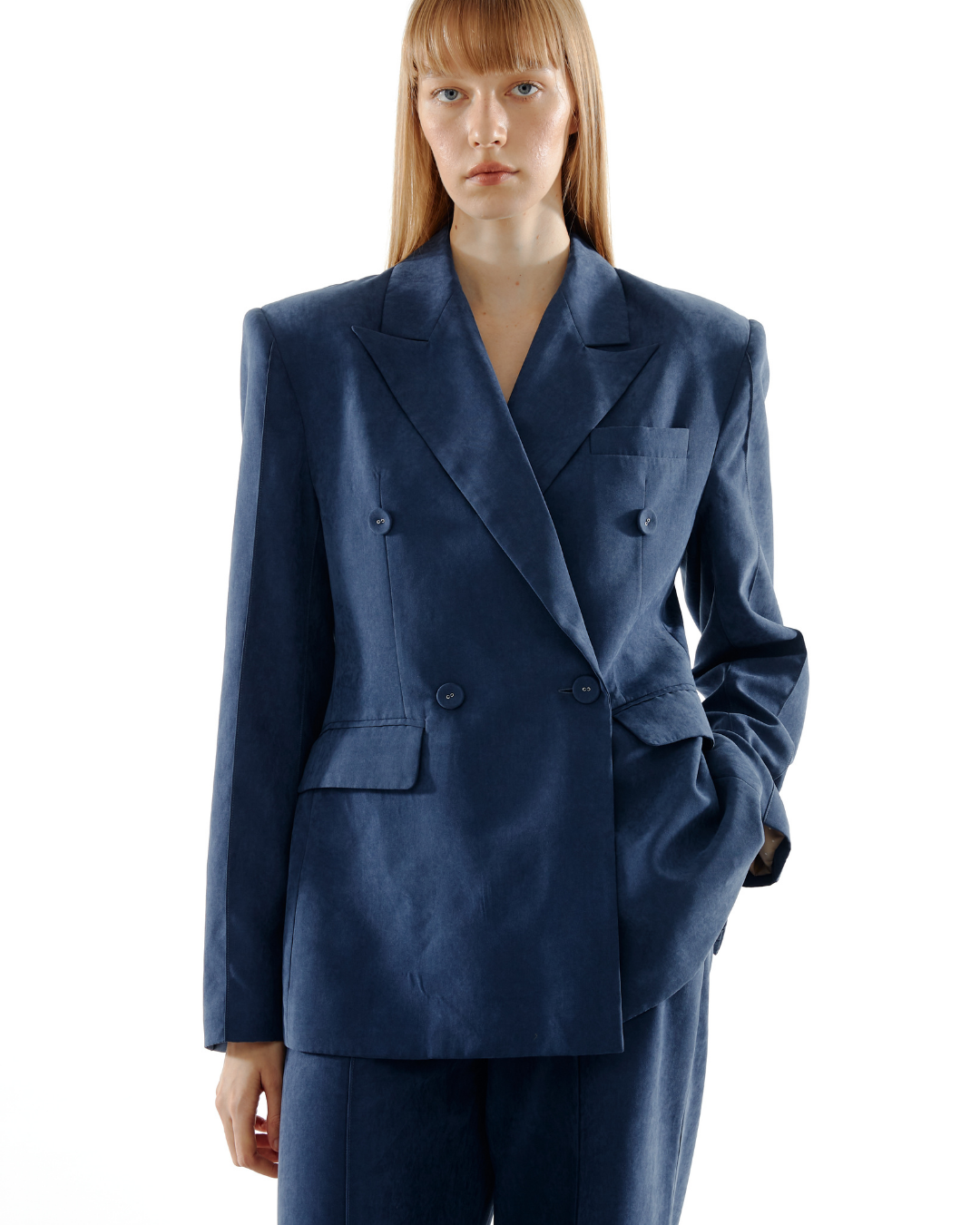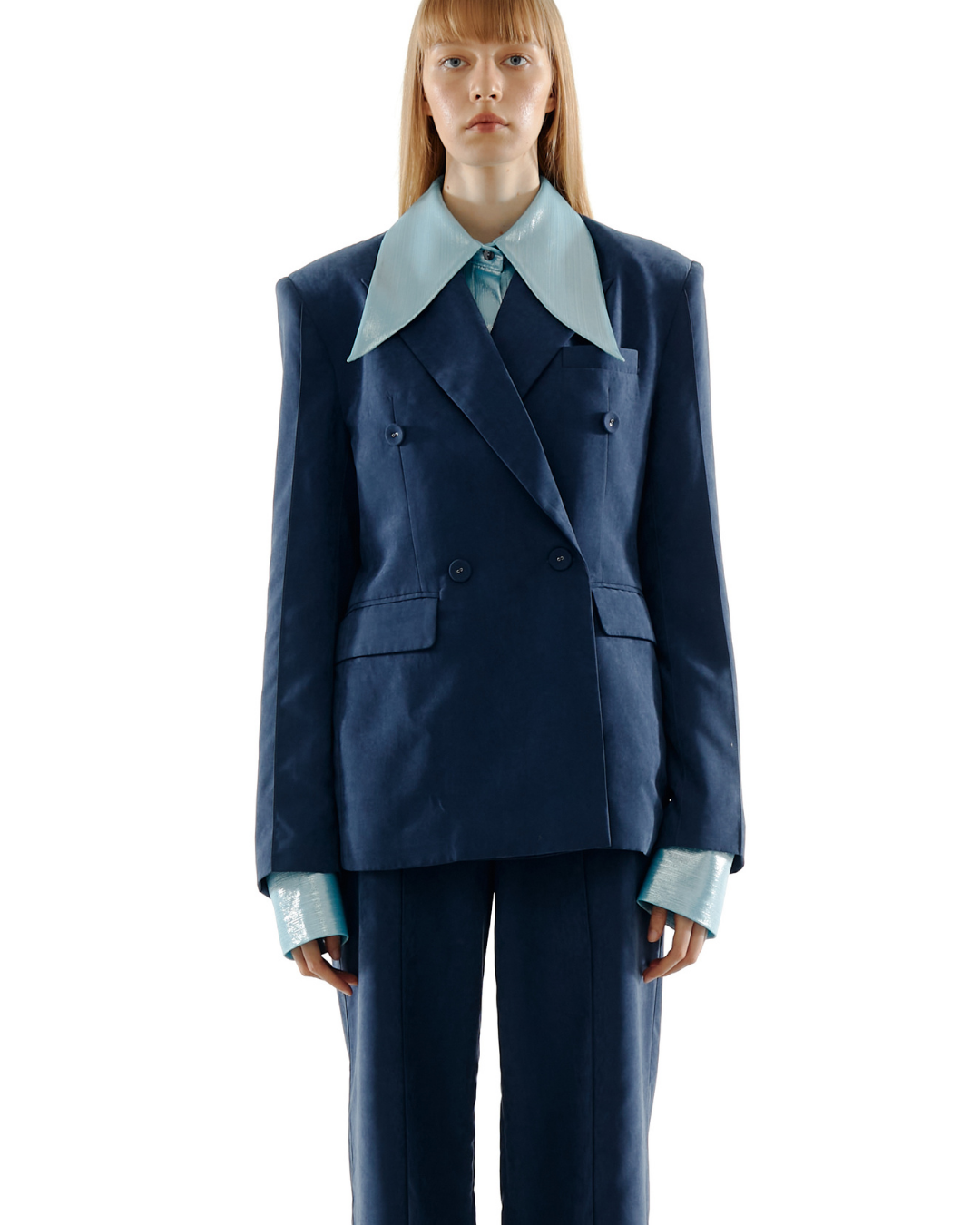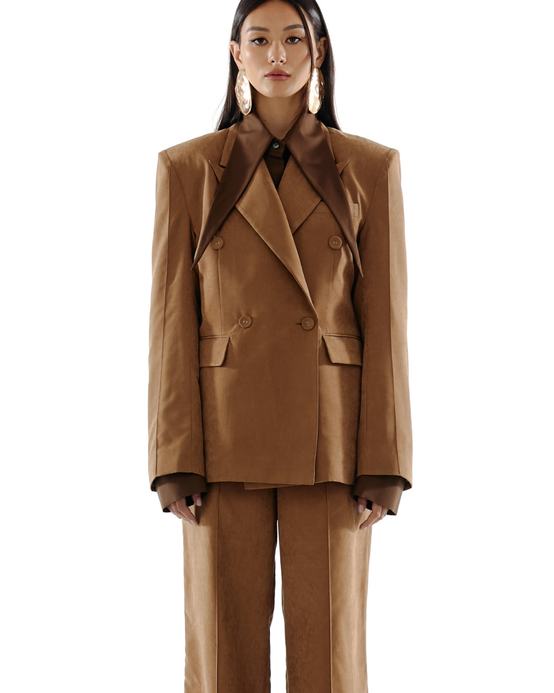 เสื้อเบลเซอร์ผ้าหนังกลับ แขนยาวที่ปลายแขนมีผ่าพร้อมกระดุม มีกระเป๋าด้านหน้าและกระเป๋าที่หน้าอก ชายเสื้อตรง ติดกระดุมด้านหน้า และผ่าด้านหลัง