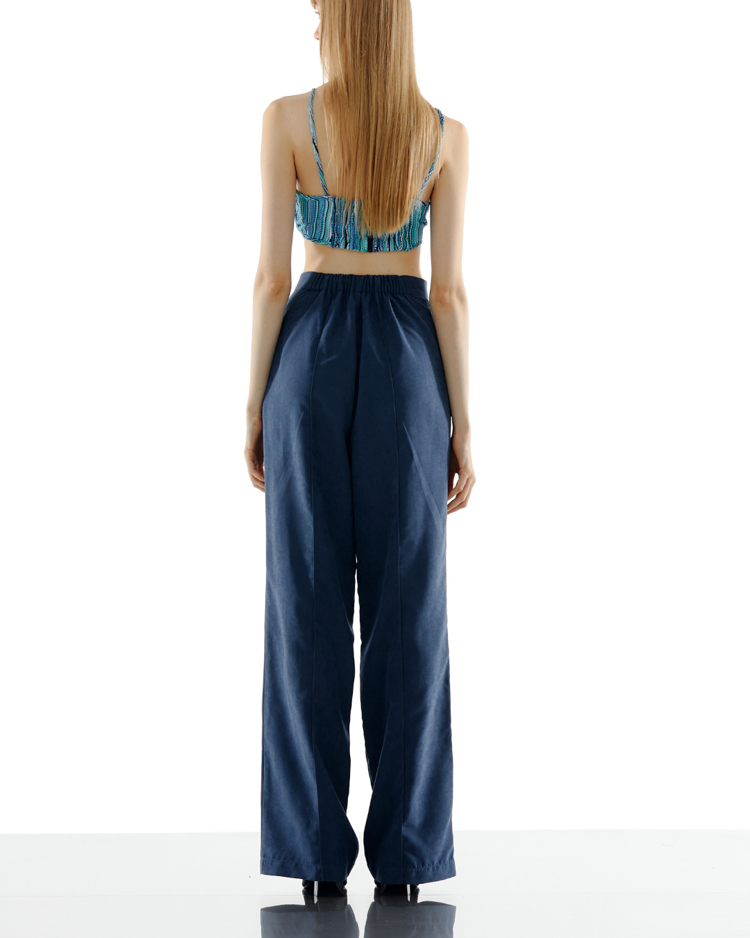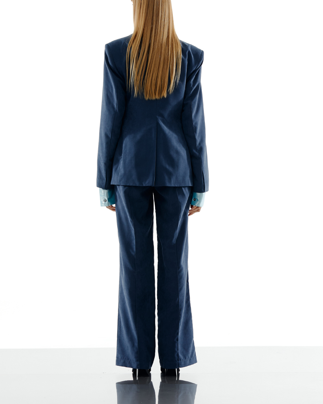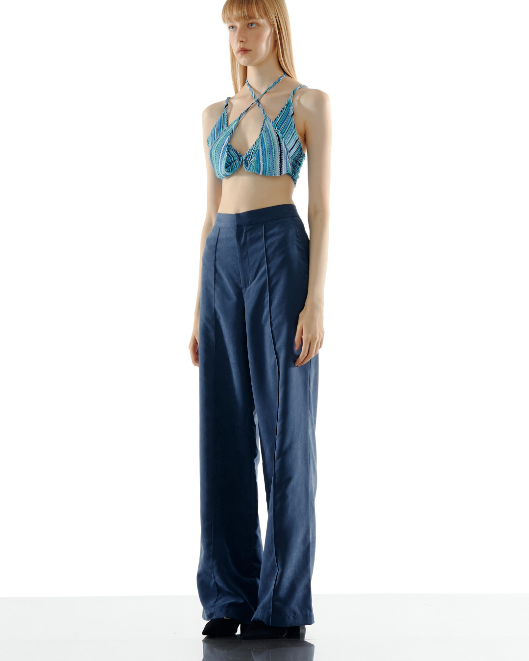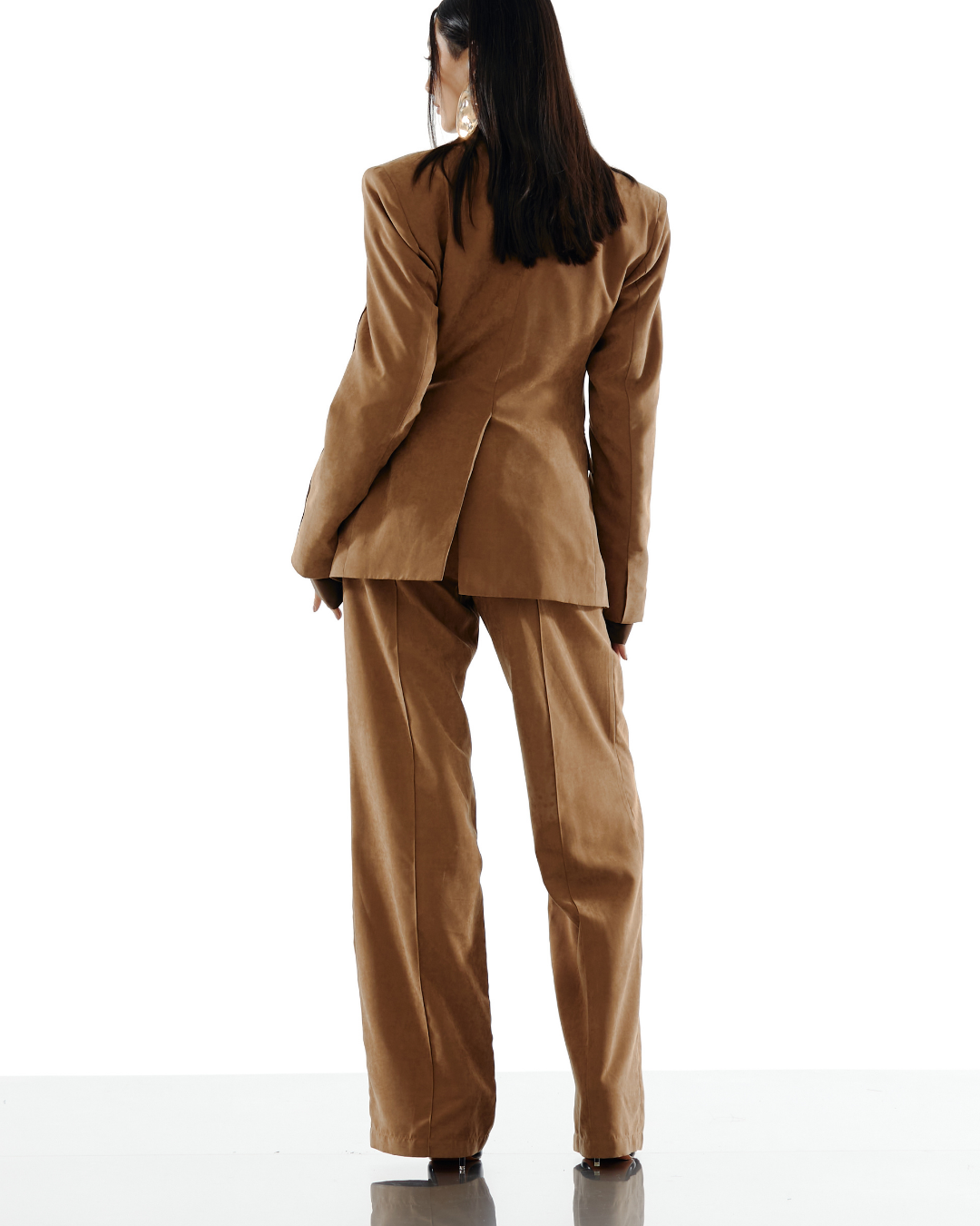 High-waist pants made of suede fabric with a pronounced front dart. Side pockets with an elasticated waistband at the back. Zip and metal hook fastening.