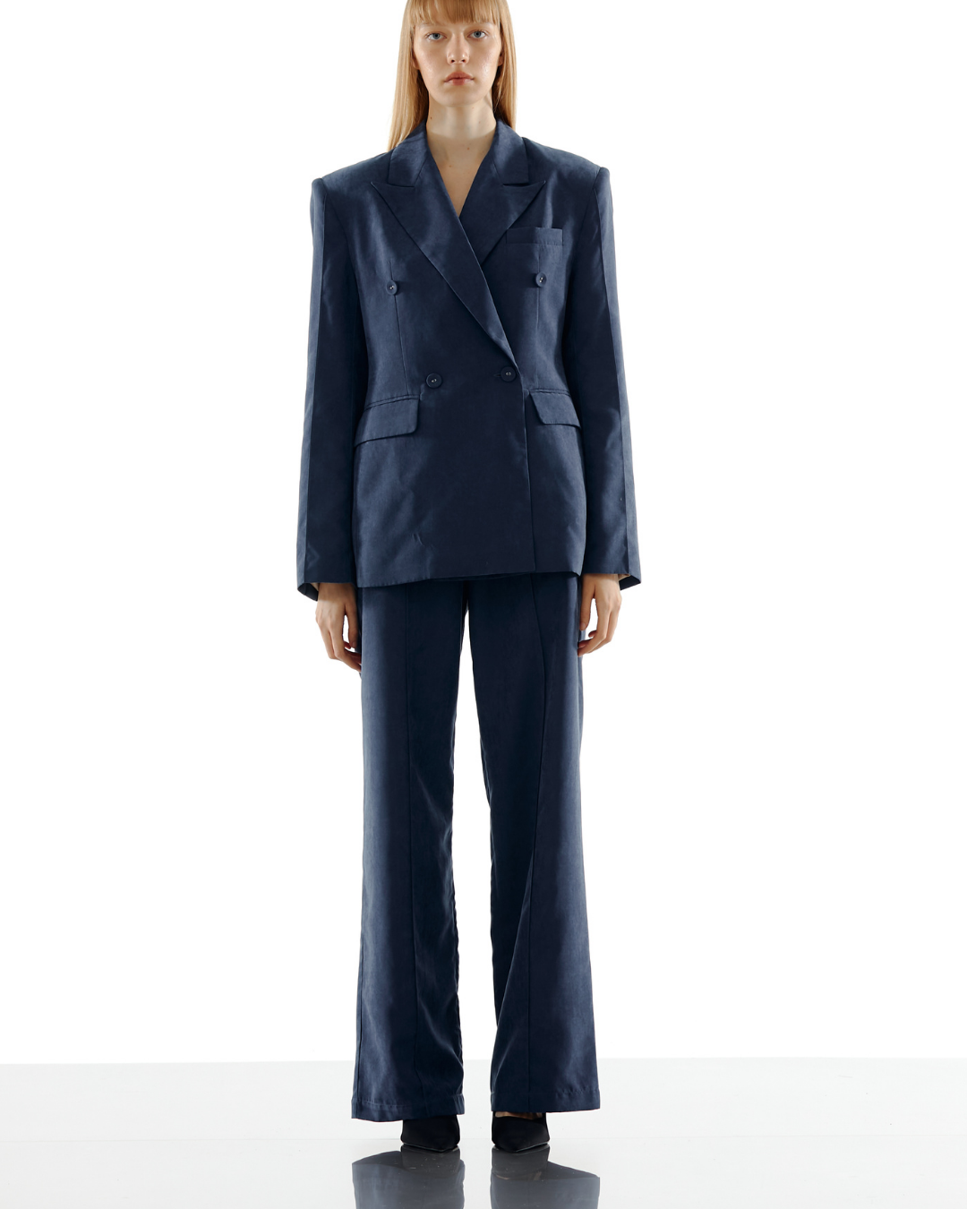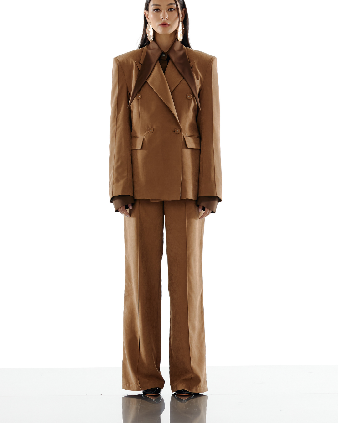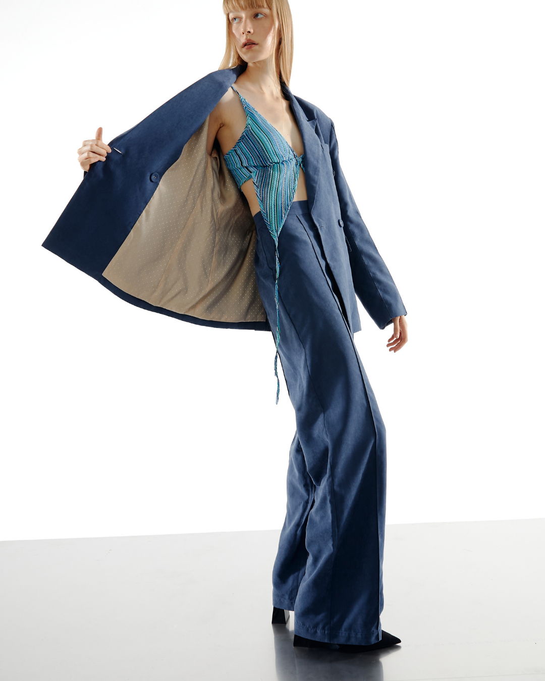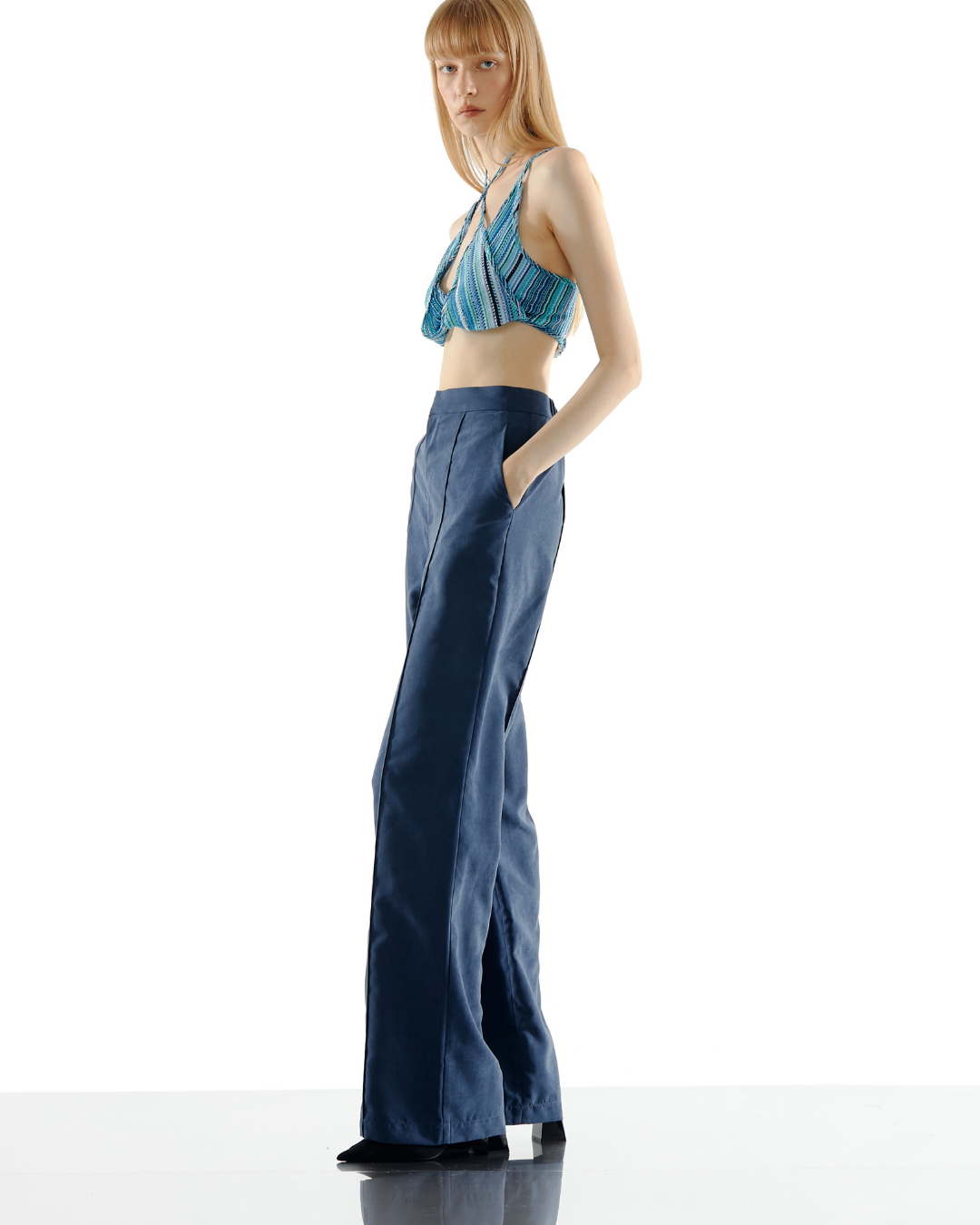 High-waist pants made of suede fabric with a pronounced front dart. Side pockets with an elasticated waistband at the back. Zip and metal hook fastening.