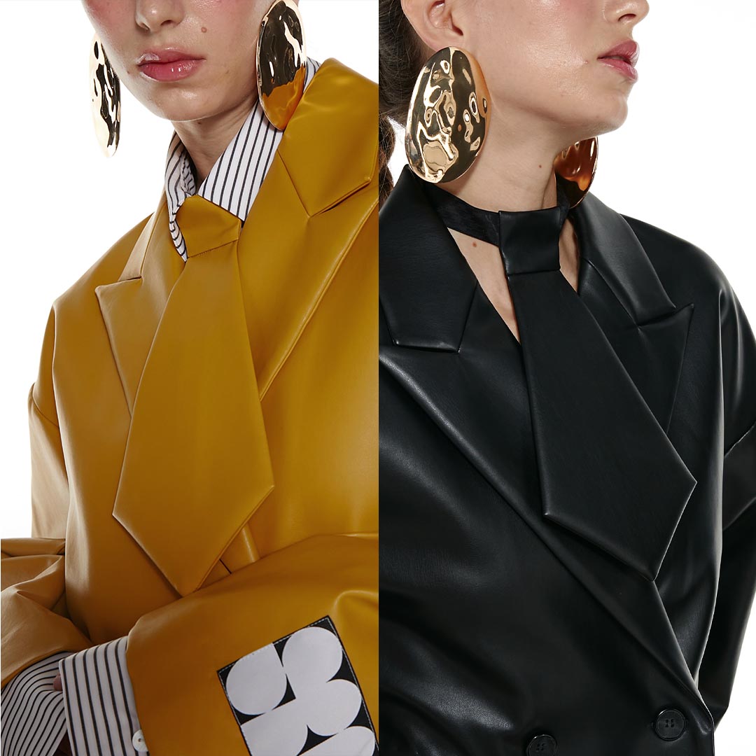 Pastel spear collar oversized shirt in 70’s style with cotton striped texture fabric, the pockets detailed with cotton polkadot fabric, and ‘The SRT’ logo tag on the left sleeve